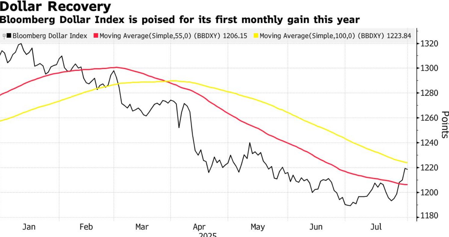 统计数据显示,截至美国时间早盘交易,彭博美元现货指数7月上涨2.5%,这是自唐纳德·特朗普总统今年1月正式宣誓就职以来唯一一个实现上涨月份。尽管美联储官员表示经济增长正在放缓,但本周公布的数据显示,美国经济第二季度以3%的速度超预期扩张,在贸易政策不断变化的背景下这一数据颇为稳健,降息预期则因美联储主席鲍威尔表示在关税和通胀仍充满不确定性的情况下当前的利率水平是合适的,以及核心PCE物价指数在6月份同比上涨2.8%,高于预期的2.7%,创下2月以来最高水平。