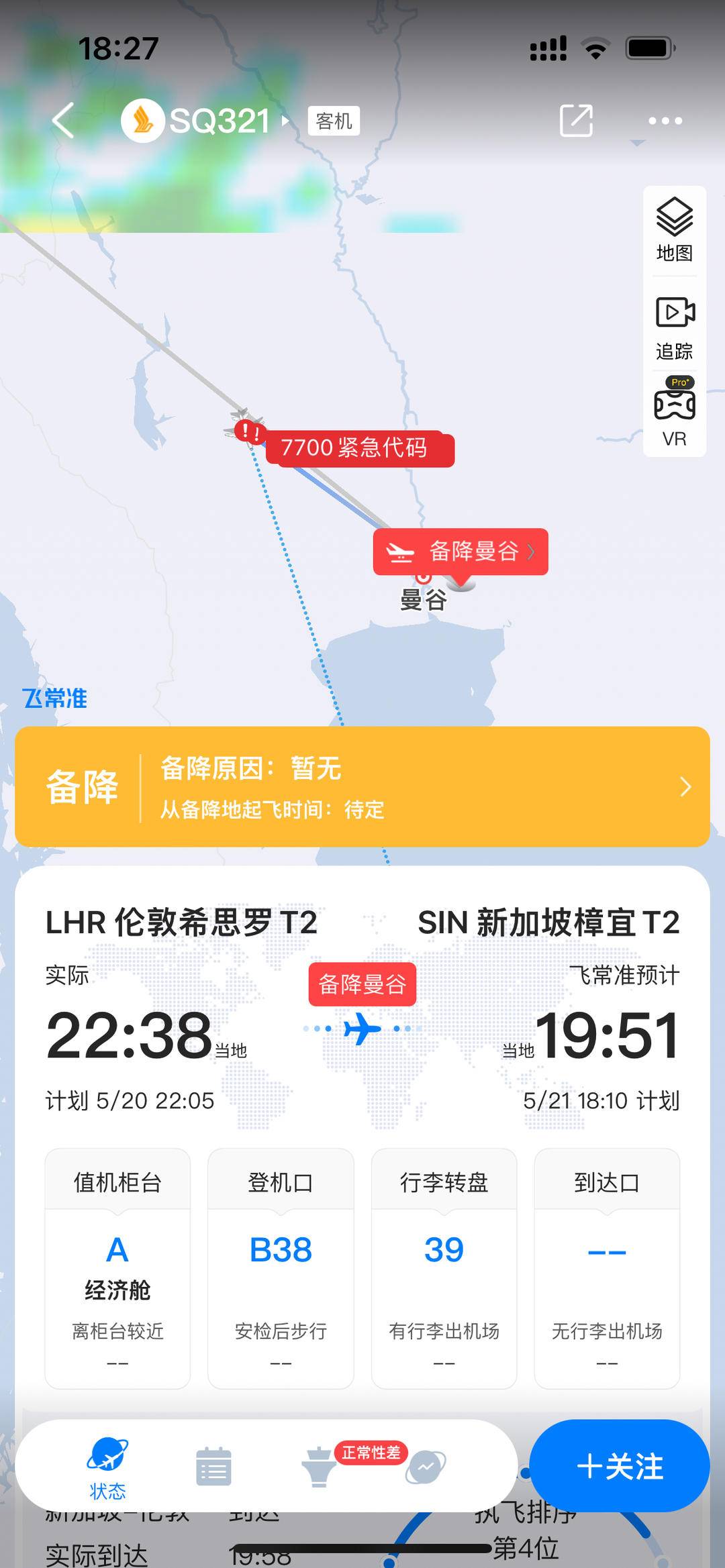 5月21日讯(记者徐媛园)据报道,当地时间5月21日,新加坡航空一架客机紧急备降泰国曼谷素万那普机场,造成1人死亡、30人受伤。据飞常准数据显示,该航班为新加坡航空SQ321,于5月20日当地时间22:38从伦敦希斯思罗机场起飞,泰国当地时间15:45备降曼谷素万那普机场。飞机机型为波音777-300ER。